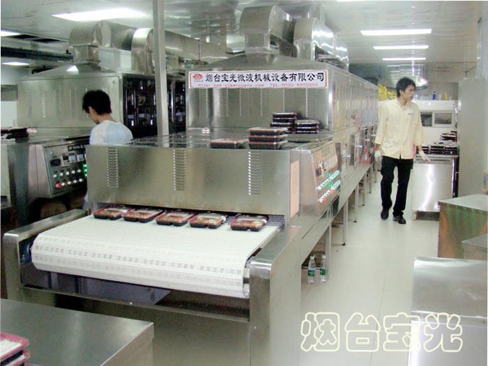 烟台宝光微波机械设备有限公司,根据客户的盒饭产量和场地等要求选型,功率在10—200千瓦。适用企业,学校、快餐公司、餐饮店、赛场、展会等的盒饭配送,其优点是产量高、连续快速,2分钟左右即可达到温度要求。不破坏饭菜的营养成分、不变色、不改变风味。同时,由于加热过程中,微波的热效应和非热效应共同的作用,对饭菜起到了杀菌作用,满足了食品的卫生指标要求。
