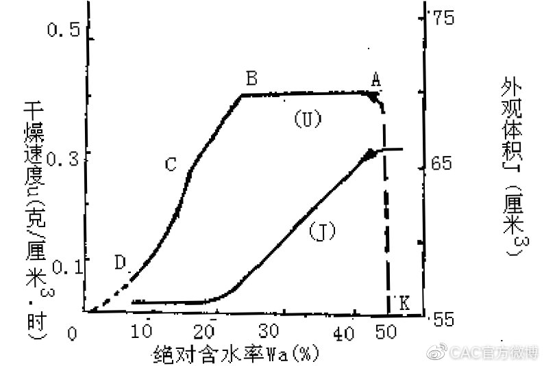 上图中A-B就是等速干燥阶段,此时水分自生坯外表面的连续水膜蒸发,内部水分不断补充,内、外扩散速度相等,干燥速率固定不变。随着含水率降低,颗粒在水的表面张力作用下被拉近,生坯逐渐收缩,收缩的体积相当于排除水的体积,因此该阶段应使生坯表面温度均匀、不变。